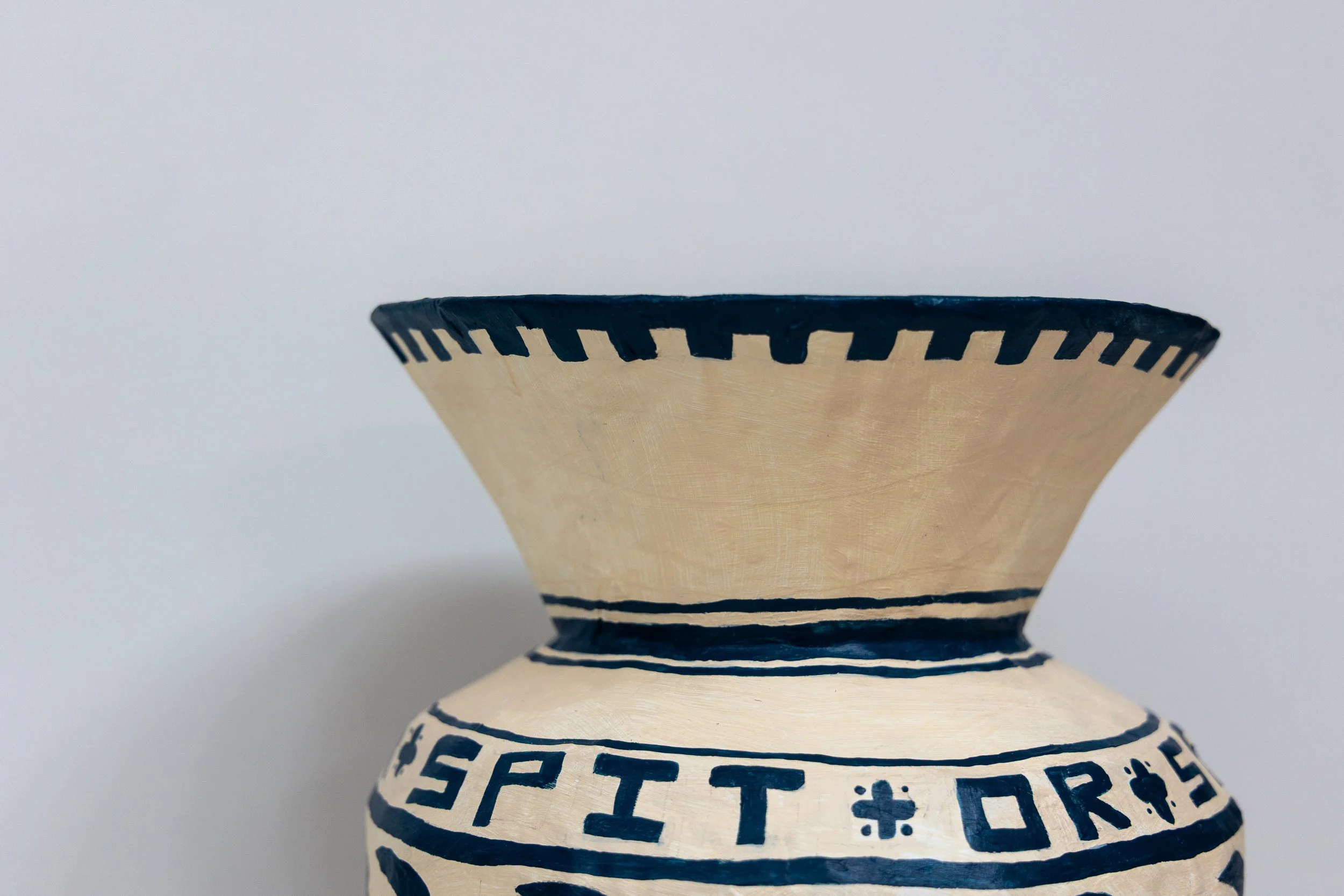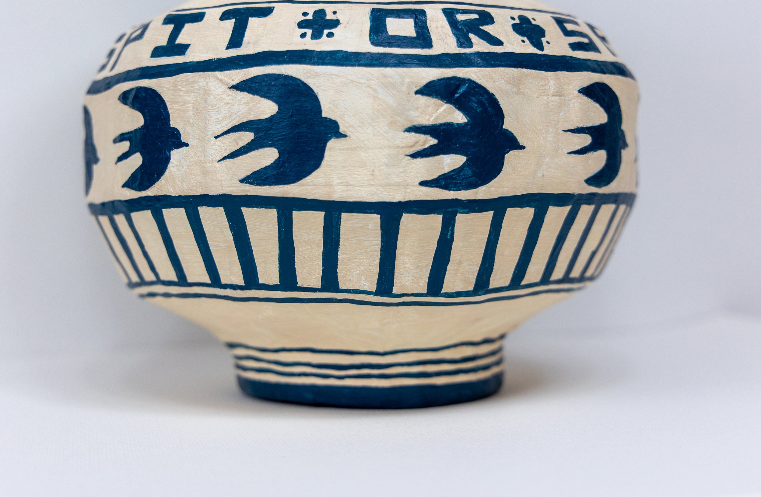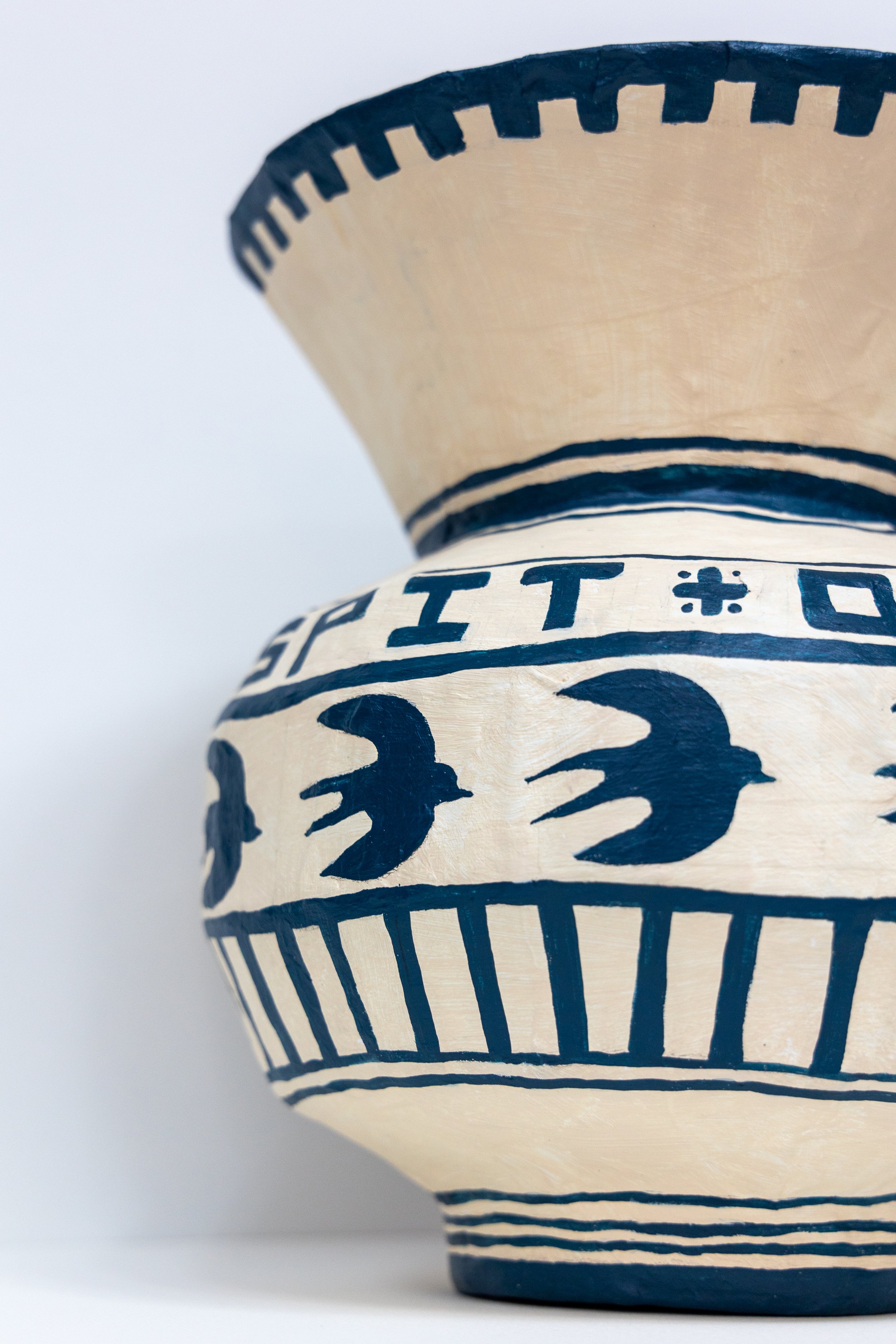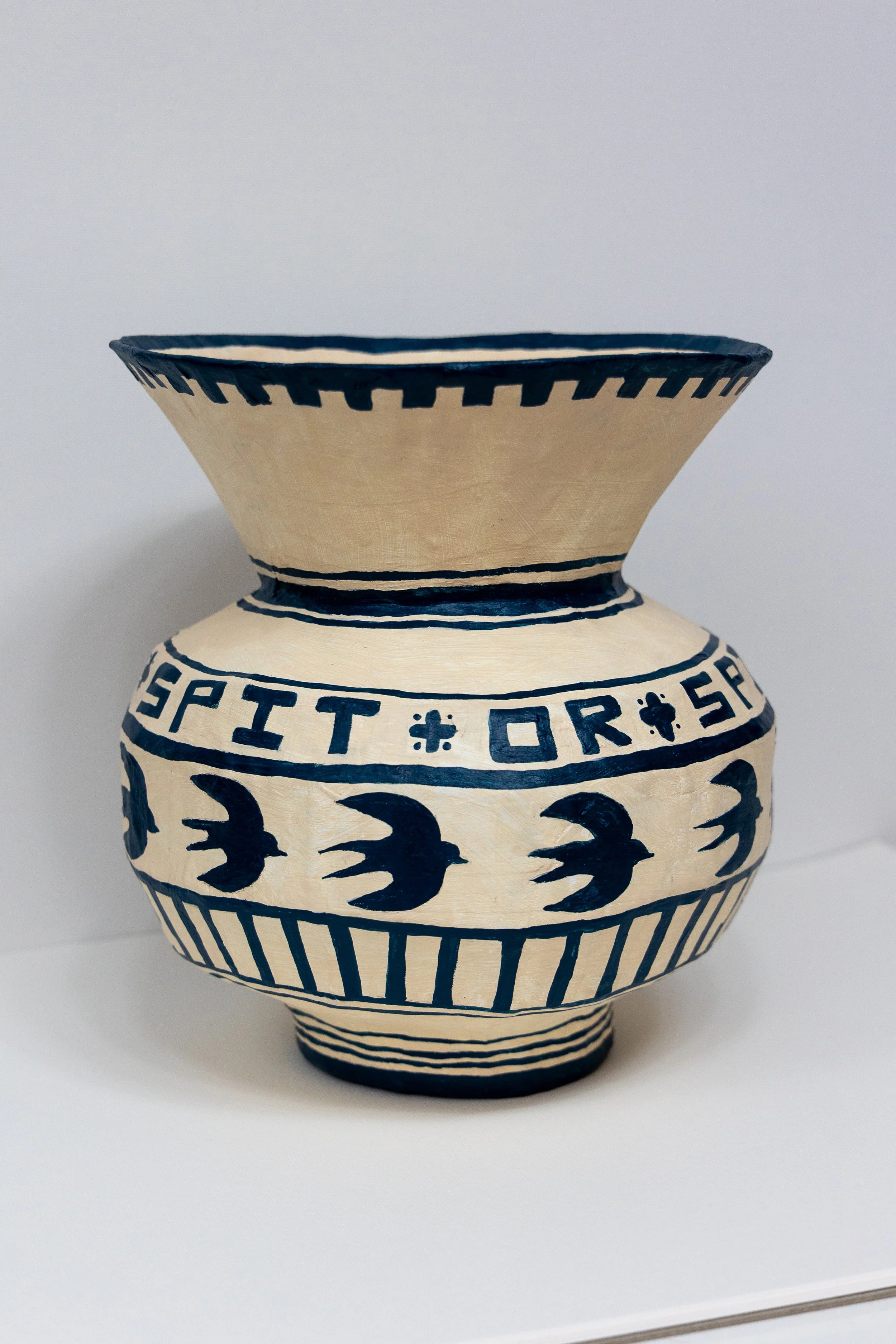 The words ‘spit or’ circle the pot in a decorative loop, seemingly nonsensical until your brain catches up and translates the band of swallow silhouettes directly underneath.